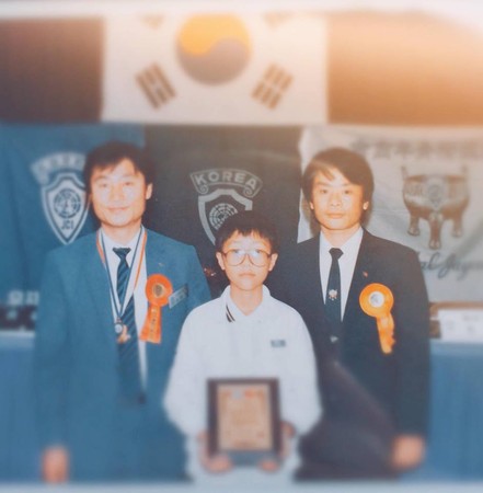 照片中,可以看到阿信顶着眉上短浏海的发型,戴着类似椭圆形镜框的复古眼镜,身穿白色上衣,双手捧着奖牌,神情看起来十分淡定,镜头一拉远才发现,原来他当天直接穿短裤上台,在所有小朋友当中,可说是高人一等,一双大长腿相当吸睛,180公分的他似乎从童年照就能看出端倪。