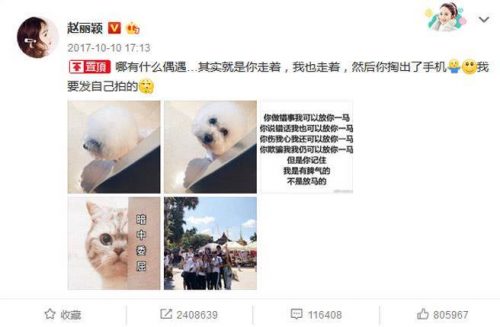 赵丽颖先后被爆怀孕及婚讯,她仅透过工作室简单回应“没有这样的事”,并未亲自发言过,昨晚她突然将去年的微博发文置顶,该文写道:“哪有什么偶遇,其实就是你走着,我也走着,然后你掏出了手机,我也要发自己拍的”,除了搭配萌犬照外,其中有张写满文字的图片特别引人注目,内容是:“你做错事我可以放你一马,你说错话我也可以放你一马,你伤我心我还可以放你一马,你欺骗我我可以放你一马,但是你记住,我是有脾气的,不是放马的”,疑似暗示不愿在放过造谣者。