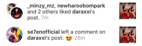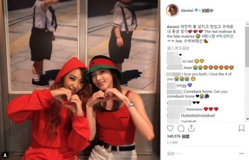 Minzy虽然没有上传合照,但也在Dara照片下留言“超级山兔子(Dara的昵称)”,并加上亲吻嘟嘴的表情符号展现热情。不仅如此,旧成员朴春看到照片也来按赞,一直陪伴2NE1成长的前公司前辈Se7en也眼冒爱心回应,展现以往YG Family的好感情。