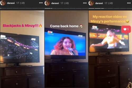 而Dara在加入2NE1之前,小小年纪在菲律宾出道并累积不少名气,甚至被誉为“菲律宾宝儿”,看到妹妹来成长的家乡表演,她死守电视机前面并拍下Minzy表演画面,不但大喊Minzy名字,还跟着一起唱2NE1的歌曲,看到台下满满的粉丝手灯,也呼喊粉丝名字Blackjack。