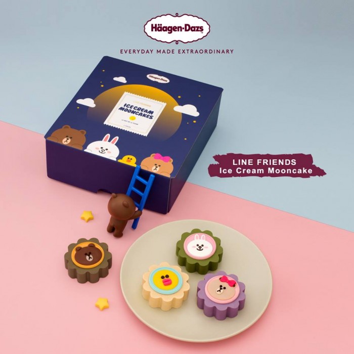 Haagen-Dazs今年推出了超卡哇伊的LINE FREINDS中的卡通人物Brown、Cony、Sally和Choco组合的冰淇淋月饼,包括香草、澳洲坚果及绿茶3种口味!