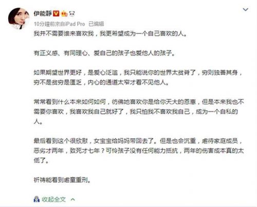 有感于此,伊能静火力全开说:“我只能说你的世界太贫脊了,穷则独善其身,穷不是贫穷是匮乏,内心的通道太窄才看不见他人”,也酸网友常常留言说“本来如何如何”,像是给予名人的喜爱就像赐恩般了不起,但她自觉不需要,强调:“我只怕我不喜欢我自己,成为一个自私的”。