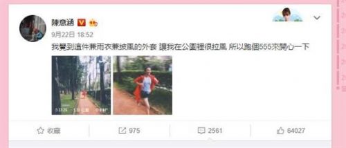 陈意涵挺5月孕肚腿超细!狂奔5公里 网吓:慢点 25 Sep , 2018 | 娱乐前线 女星陈意涵与导演许富翔在七夕情人节登记结婚,并坦言肚皮有喜,而现在怀孕5个月的陈意涵,活泼个性依旧,她日前还晒奔跑照,她用37分25秒跑完5.55公里,看了让网友替陈意涵捏了一把冷汗,劝她跑慢点。 陈意涵日前发文炫耀自己有拉风的外套,开心的她直接挺着5个月孕肚,在公园跑步,陈意涵用37分25秒跑完5.55公里,陈意涵跑得开心,网友却是替她紧张,纷纷留言提醒:“你不是怀孕了吗姐”、“跑慢点”、“baby在肚子里和你一起跑保护好宝宝哦”。 分享
