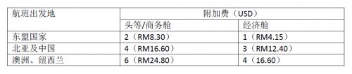 马航来往大马航班需缴燃油附加费 25 Sep , 2018 | 民生关注, 民生百事 (吉隆坡25日讯)马航宣布从本月18日起,重新向乘客征收4至24令吉的燃油附加费,费用因地区及舱位而定。 马航在其官方网站发表文告指出,随着国际燃油价格不断上涨,马航已从本月18日向从大马出发的所有机票征收该费用。 燃油附加费如下: 不仅是从大马飞往国内外的航班需缴付燃油附加费,从外国入境大马的马航航班也无法幸免。 马航在8月13日时向入境航班征收了1美元自12美元的燃油附加费,即: 马航曾征收过燃油附加费,不过在2013年7月、11月及12月逐步取消相关费用。 分享