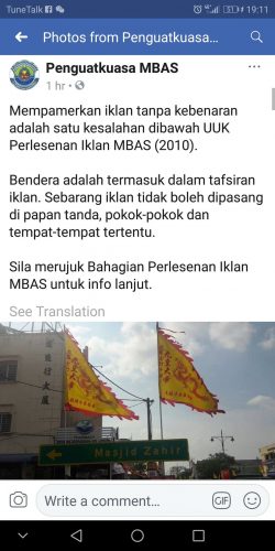 执法组在面子书上载九皇爷诞黄旗时指出,这些旗违反了MBSA(2010)广告执照法例,指广告内容也包括旗帜,应该注册及缴费,随即把多个属于亚罗士打斗母宫的黄旗拆下,引起关注。