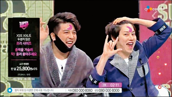 队长利特为强调面膜能打造“V字脸”,现场表演“尖下巴撕纸”特技,被粉丝吐槽“广告不实”,而神童、希澈则是将半月形的眼膜贴在额头上,搞笑热唱《包青天》、《美少女战士》主题曲,浮夸演出逗乐观众,除了顺利带动完售业绩,收视率比起平时更高出6倍,而SJ此次出击购物台,产品部分收益也将以歌迷名义进行捐赠。