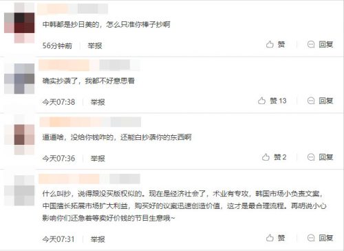 在统计出34个节目被抄袭的消息传出后,大陆网友普遍表示:“是事实!我都不好意思看了。”认为别人的创意可以做为启发,但是照搬形式这种行为真的不要再做了,不过也有人认为,南韩节目也是抄日本、美国,没资格说抄袭,更有人说,“韩国市场小负责文案,中国擅长拓展市场扩大利益,购买好的议案迅速创造价值,这才是最合理流程。”