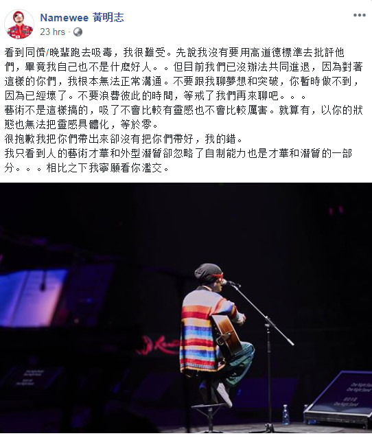 黄明志8日突然发文表示“看到同侪/晚辈跑去吸毒,我很难受!”虽然并未指名,但文中透露他与对方有合作,还说:“很抱歉我把你们带出来,却没有把你们带好,我的错。”引起网友猜测。