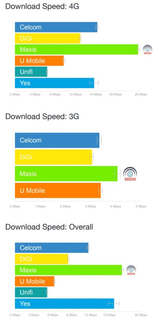 OpenSignal最新报告 Maxis 4G网速最快 14 Apr , 2018 | 吃喝玩乐 根据OpenSignal最新报告显示,明讯(Maxis)是大马网速最快的电讯公司。 这项报告是根据用户于2017年12月1日至2018年2月28日期间,所进行的网速测试。 在平均下载速度方面,Maxis以16.96Mbps排名第一,Yes则是以15.7Mbps排名第二。 整体上来看,Maxis的网速是最强大的,Celcom则明显有着相当大的进步。 分享