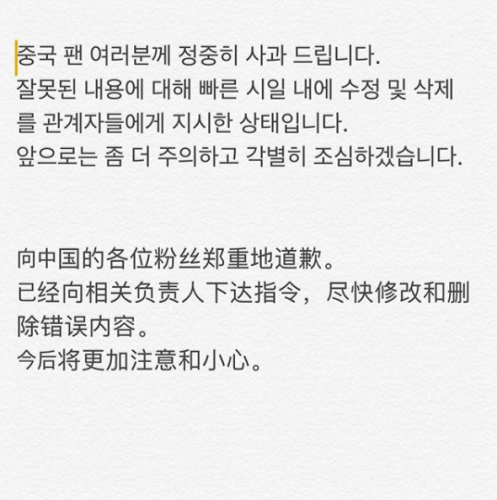 YG娱乐会长梁铉锡通过个人社交平台公开了道歉文。“向中国的各位粉丝郑重地道歉。已经向相关负责人下达指令,尽快修改和删除错误内容。今后将更加注意和小心。 ”
