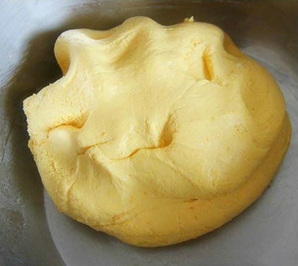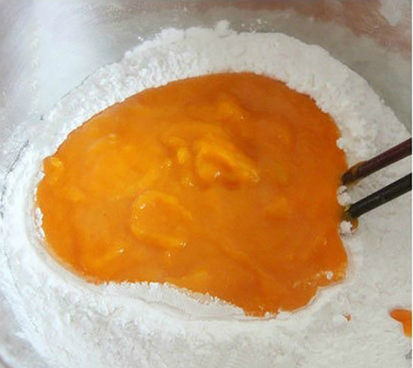 4.将南瓜泥倒入糯米粉里,用筷子搅拌成面片