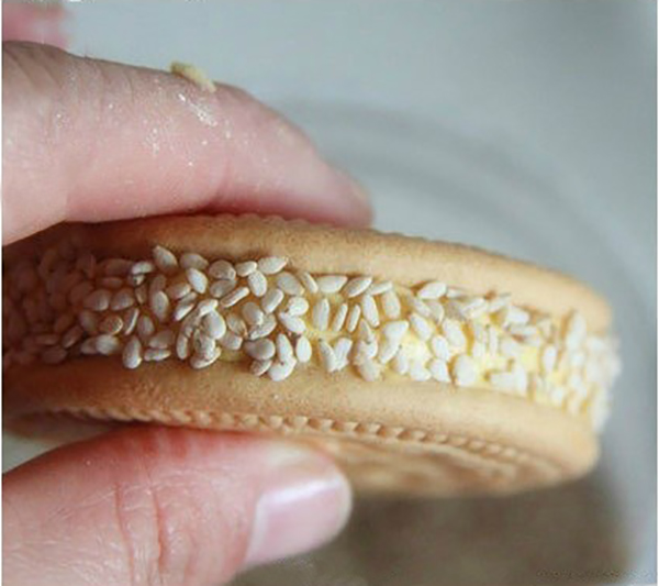 7.夹好面团的饼干侧面,在白芝麻里滚一圈,让其均匀的粘上芝麻