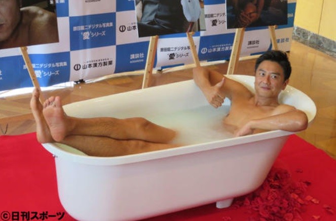 原田龙二的全裸数位写真《爱》,以温泉旅行为主题,12日在东京举行记者会,为配合写真主题,他直接将浴缸搬至活动现场,甚至还全裸亮相,仅以黑色澡盆遮住重要部位,展现结实好身材,之后进入满是泡沫的浴缸里泡澡。