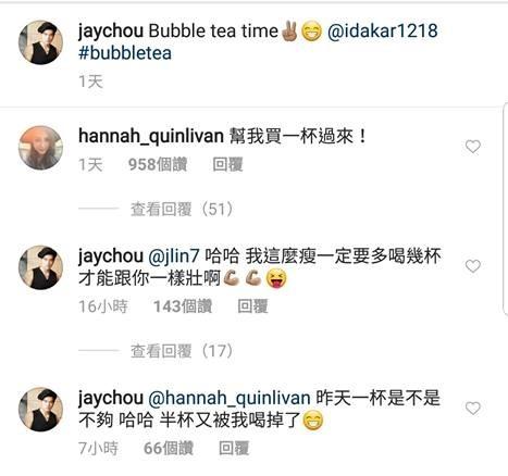 Darren一起喝珍珠奶茶的照片,引来受伤的昆凌留言“帮我买一杯过来”。谁知,周杰伦当晚果然就现身片场,并带来老婆想要的饮料,令昆凌大呼“谢谢你带珍珠奶茶来探班”,心情似乎大好,甜蜜无限。