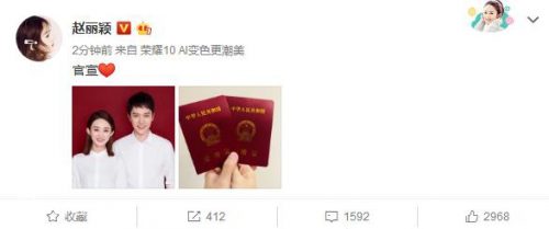 赵丽颖冯绍峰晒结婚证官宣喜讯! 16 Oct , 2018 | 娱乐前线 赵丽颖和冯绍峰在微博晒出结婚照、结婚证,宣布结婚喜讯。 赵丽颖在31岁生日当天大方公开与冯绍峰结婚证,配文“官宣”正式宣布结婚喜讯。卡在双方生日的时间点,也是很甜了!两人合作过《西游记女儿国》《知否知否应是绿肥红瘦》,多次被网友偶遇拍到同框,却始终未承认过恋情,如今直接公布婚讯。 冯绍峰在赵丽颖微博下留言:“老婆,生日快乐!”,网友纷纷表示:“要幸福哦!”“要对她好啊!”“希望你能永远幸福! 分享