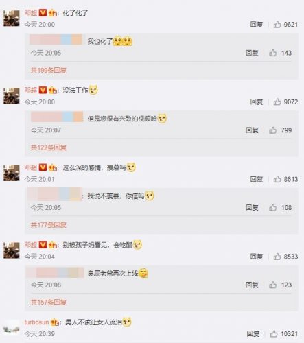 虽然粉丝反应不一,邓超随后又在自己的PO文底下留言,以开玩笑口吻感慨“没法工作”、“这么深的感情,羡慕吗”、“别被孩子妈看见,会吃醋”。孙俪也迅速回应调侃:“男人不该让女人流泪。”态度就和平常差不多,让大部分的粉丝安下心,猜测应该不是真的要息影。不过,也有不少人心疼说“看影片哭了”,提醒邓超有空还是要多陪陪小孩。