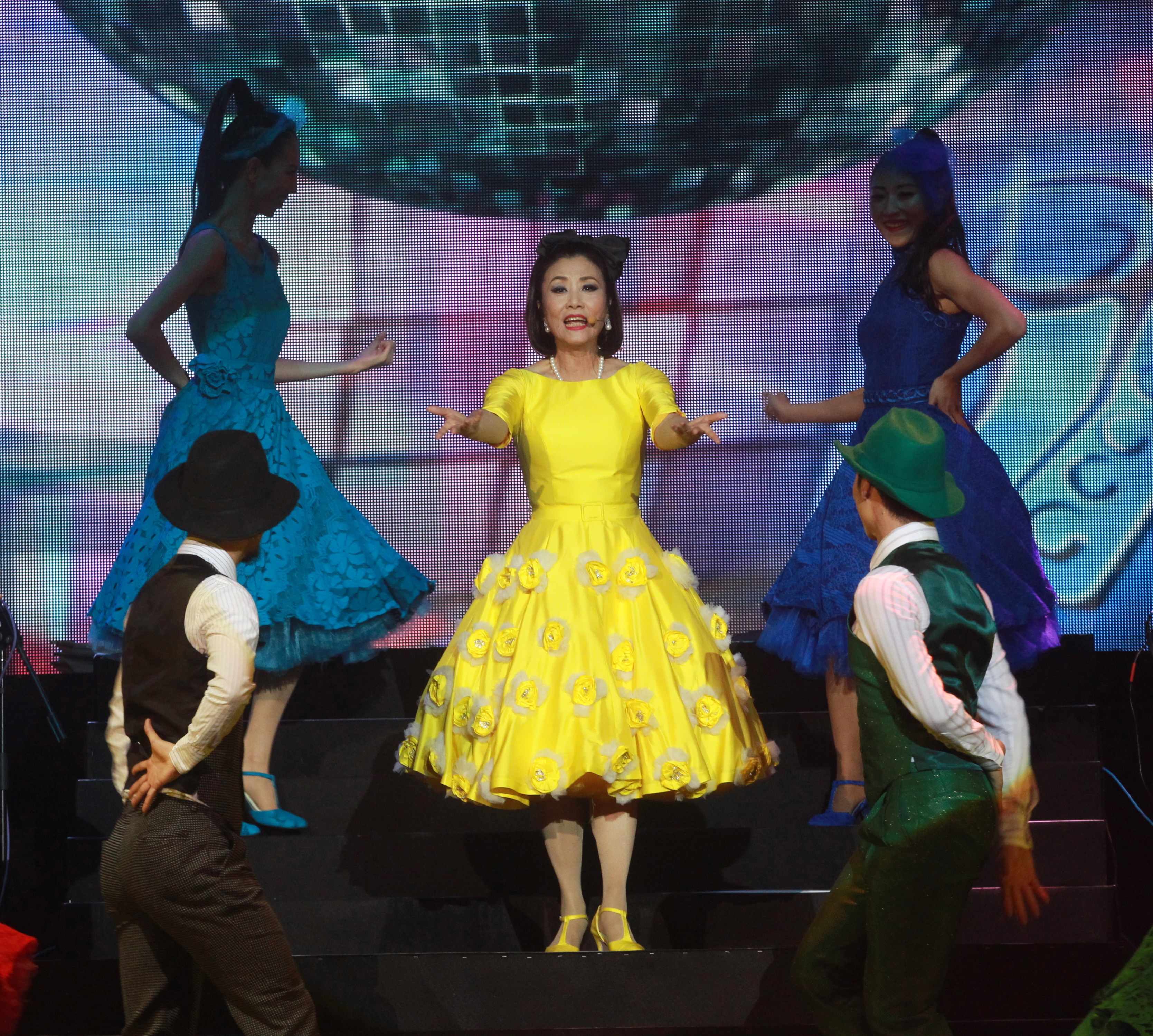 是晚她以亮眼鲜黄色复古裙子,再搭配黄色高跟鞋出场载歌载舞多首来自5、60年代的超经典歌曲,如《给我一个吻》、《何日君再来》、《玫瑰玫瑰我爱你》、《夜来香》等。她头发上绑着黑色的蝴蝶结与青春bob头,看上去少女味十足!眼见台下歌迷爆满,她相当感动并感谢大家支持。她续称,以上歌曲也是其事业的启蒙期,今晚也会从多首歌曲中让大家发掘到不同的年代有着不同的转变与发展。