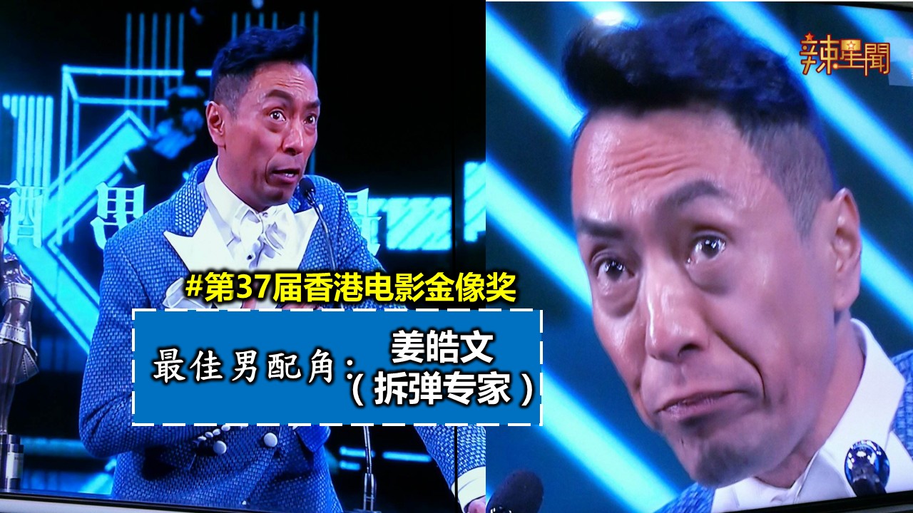 最佳男配角、女配角被饰演《拆弹专家》的姜皓文、《明月几时有》叶德娴收入囊中。姜皓文今次第二次入围金像奖“最佳男配角”、亦是首次获奖,他领奖时忍不住感动落下男儿泪,坦言一路走来遇到很多好人、坏人,但终于证明自己,不忘感谢老婆殷宁(原名金慧英),还对着台下的老婆和家人开心喊道:“老婆我做到了,弟弟妹妹,大哥拿到了”,同时也感谢剧中合作的刘德华。