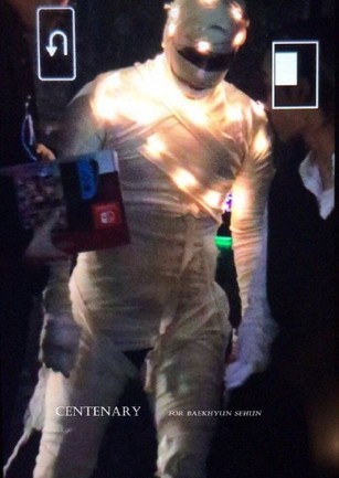 边伯贤以木乃伊造型登场,全身捆了白色绷带,只露出一双眼睛,眼睛画了特殊的烟熏妆容,同时用心戴上瞳孔变色的隐形眼镜,遮住大半张脸,要不是官方社交账号解答本尊是边伯贤,第一时间真的很难辨认。
