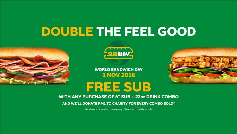 Subway推出买一送一促销 1 Nov , 2018 | 吃喝玩乐 今天是世界三文治日!Subway配合节日推出买一送一促销!只要在今天晚上9点前,购买一份6寸的Subway三文治和一杯22oz饮料,就可免费获得另外一份6寸三文治! 这项促销在全马的分行同步进行,只限Dine in及Take Away!每位顾客每次交易只能获得最多两份的免费三文治! 此外,11月1日出售的每一份6寸Subway三文治和22oz饮料,就会捐出RM1做慈善! 分享
