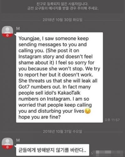 GOT7崔荣宰在社交网站上传了一张似乎是粉丝发来的短信截图,并附文称:“这个也很讨厌不要再做了,停止吧,不把话当话吗?忍耐也是有限的,每天都有不认识的人联系心情会好吗?”同时也表示:“好话说了多少遍也不听,从现在开始会收集截图放出来,不要再给我发信息了。”因私生饭问题屡禁不止,字里行间满是无奈。