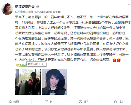 蓝洁瑛影迷会今晨发文悼念,表示:“蓝洁瑛走得很安详,警方暂时还没联系上她家姐,希望能够好好的办理身后事。”