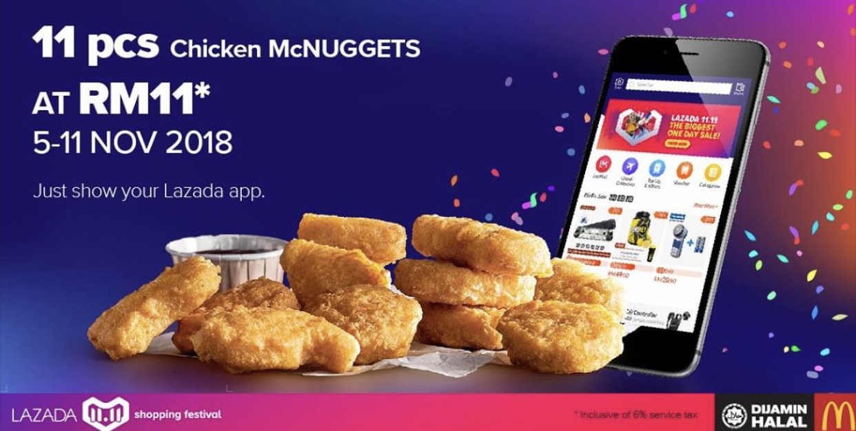 麦当劳炸鸡块促销 RM11即可购得11片 3 Nov , 2018 | 吃喝玩乐 有好康!麦当劳炸鸡块推出促销优惠,现只需RM11即可购得11片! 这项促销是由麦当劳和电商平台Lazada合作推出,从11月5日至11月11日。只要在手机下载Lazada应用程序,然后在活动期间,前往邻近的麦当劳分店,向柜台工作人员出示你已下载该应用程序即可! 这个价格已经包含了6%服务税。 分享