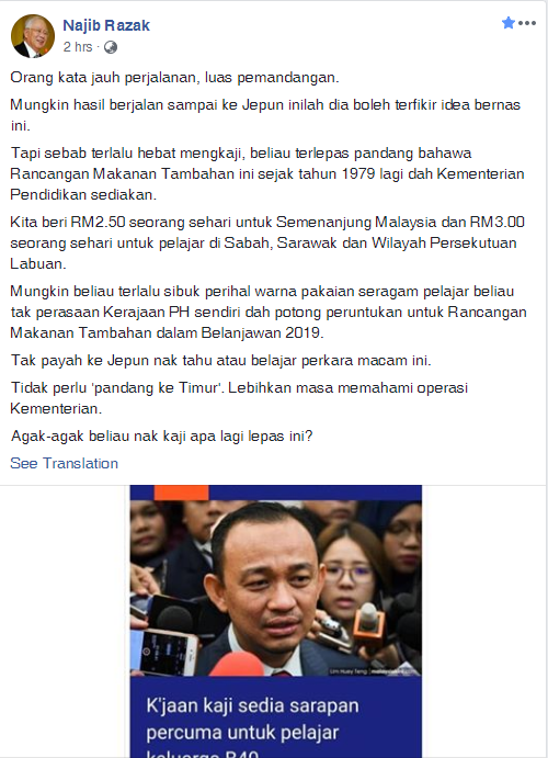 (吉隆坡7日讯)前首相纳吉揶揄教育部长马智礼只懂得如何研究学生制服颜色,而忽略了希盟政府在2019年财政预算案内已“切断” 学生免费早餐计划。
