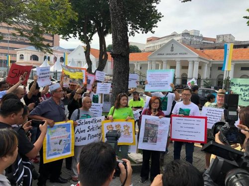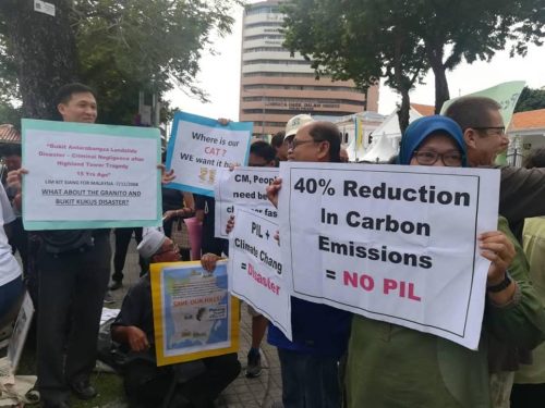 但这项宣布引起非政府组织反对,并在今日带着白菊花、猫政府画像及一则猫政府已死的讣告到槟城立法议会厅外示威,要求州政府从新检讨所有山坡计划。