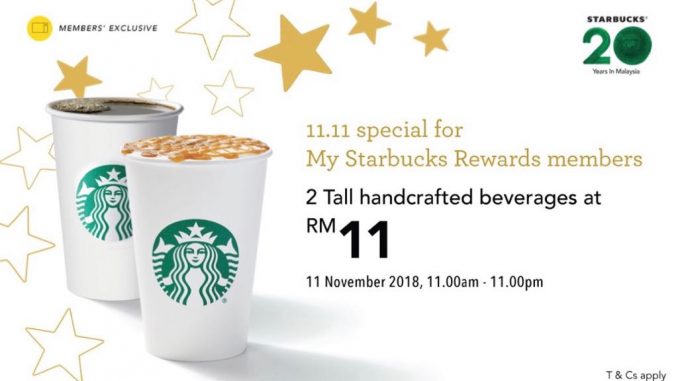 星巴克双11推出疯狂大促销 11 Nov , 2018 | 吃喝玩乐 双11全球狂欢进行中,星巴克也加入行列,推出双11疯狂大促销! 你只要在特定时间,前往临近的星巴克,就能以RM11购买到两杯Tall size的饮料!意思就是说,一杯只需RM5.50,超便宜的!不过需要注意的是,你必须是星巴克会员,并且使用星巴克手机应用程序进行付账! 这项促销只限11月11日,11am至11pm!喜欢喝星巴克饮料的朋友,可不要错过这难得的机会咯! 分享