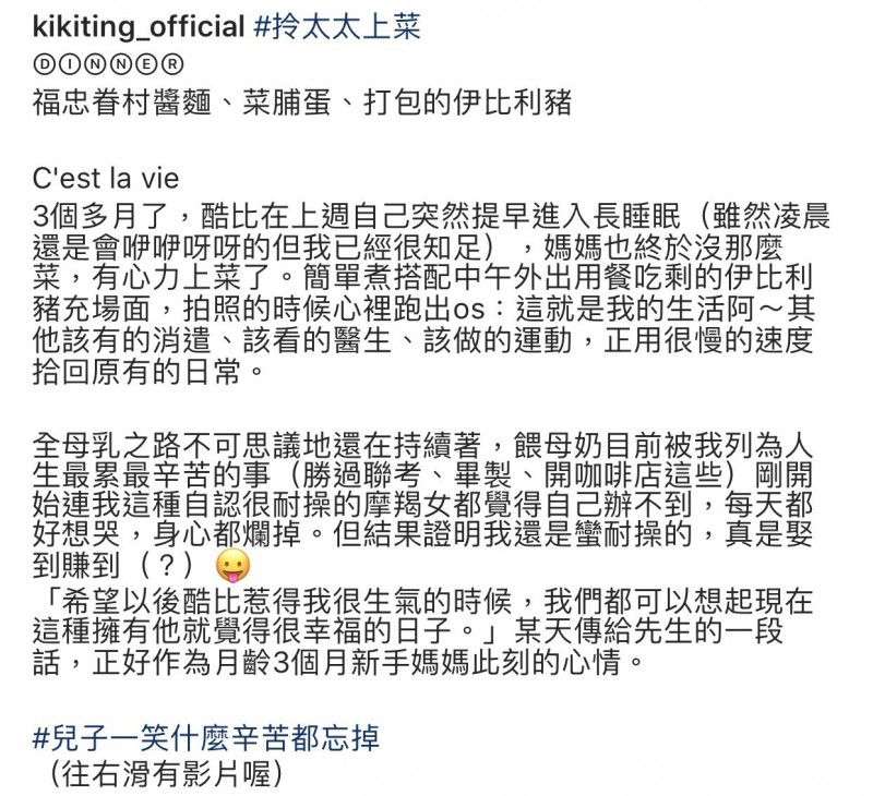 丁文琪(Kiki)与歌手林宥嘉去年步入礼堂,并在7月底生下儿子“酷比”,得到众多粉丝祝福。升格当妈后她时常分享与儿子的日常生活,日前她在Instagram透露生了小孩后“喂母奶”被她列为最辛苦的事,难过到每天都很想哭,觉得“身心都烂掉”。