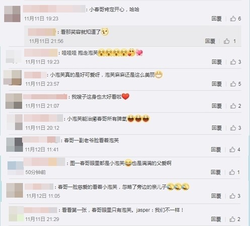 而其中一张,是陈小春回到后台后,小泡芙伸手帮他整理头发,只见照片中,一向臭脸的他,竟然露出慈父般微笑,眼睛直直盯着对方,更完全忽略了一旁的儿子Jasper。逗趣的画面更被网友调侃:“春哥眼里都是小泡芙”、“完全忽略了旁边的亲儿子”、“小春哥真的很喜欢小泡芙”。