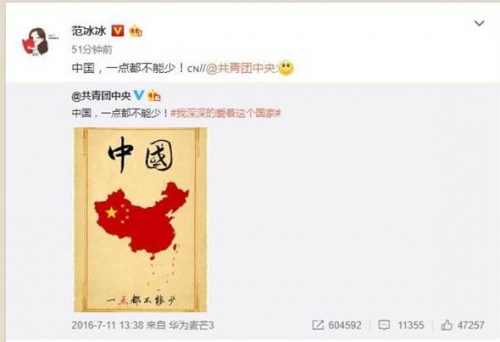 陷逃税风波的范冰冰也转发“中国,一个不能少”