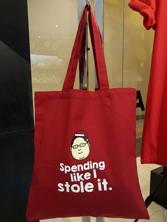 其中一个周边产品环保袋的设计更加讽刺,不止印着貌似刘特佐卡通人头,也写了“像我偷窃般花费”(Spending like I stole it),非常搞笑。