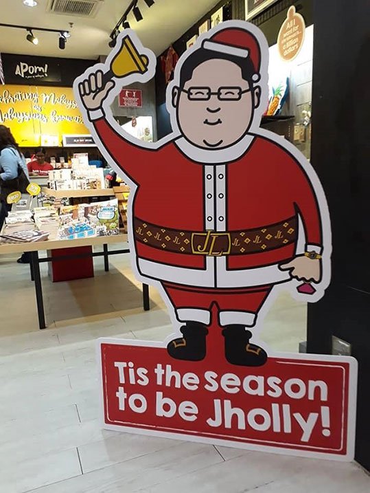 上载至网络的图片看得出是某间商场内的店铺,店铺门就放着一个戴眼镜穿圣诞老装的卡通人形纸牌,其腰带设计是“JL”字,下方的节日贺词是“Tis the season to be Jholly”,而Jho就是刘特佐的英文名。