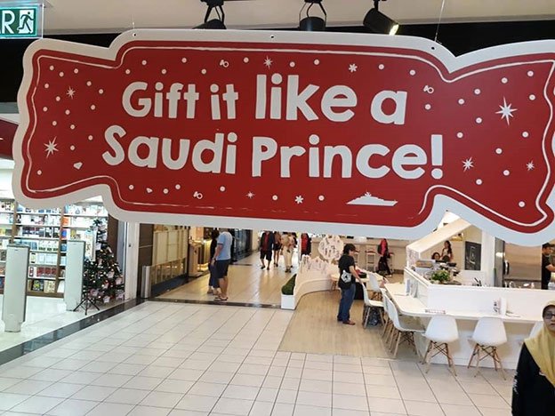 此外,店铺内也挂着“像沙地王子一样送礼”(Gift it like a Saudi Prince)字眼的糖果造型布置卡。