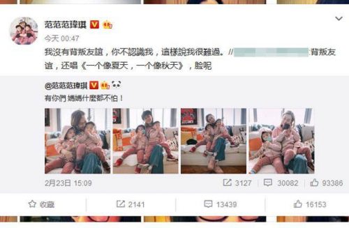 虽留言跟回文都没标记人名,但众人都猜范范是在说与张韶涵之间有心结一事,而由于时间巧合,让双姝名字登上了微博热搜前两名,甚至有人说范玮琪是对号入座蹭热度,但也有人劝她别搭理,范范也似乎平静了下来,表示:“好。我不理会了,虽说有时还是会莫名难过”,她也感谢众人关心支持,承诺“我会继续为爱我和支持我的朋友努力的”。