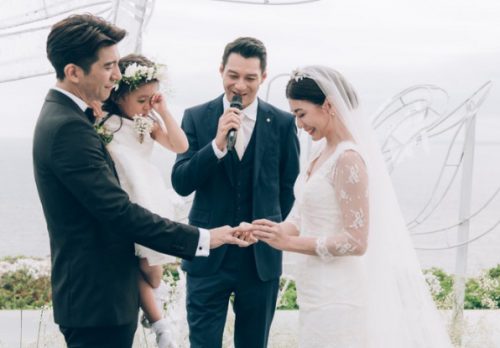 贾静雯和修杰楷的巴厘岛婚礼在25日晚间举行,在交换戒指环节,由梧桐妹捧着婚戒进场,梧桐妹害羞将婚戒转交给贾静雯和修杰楷,两人分别在她脸颊上轻轻一吻,画面相当感人。