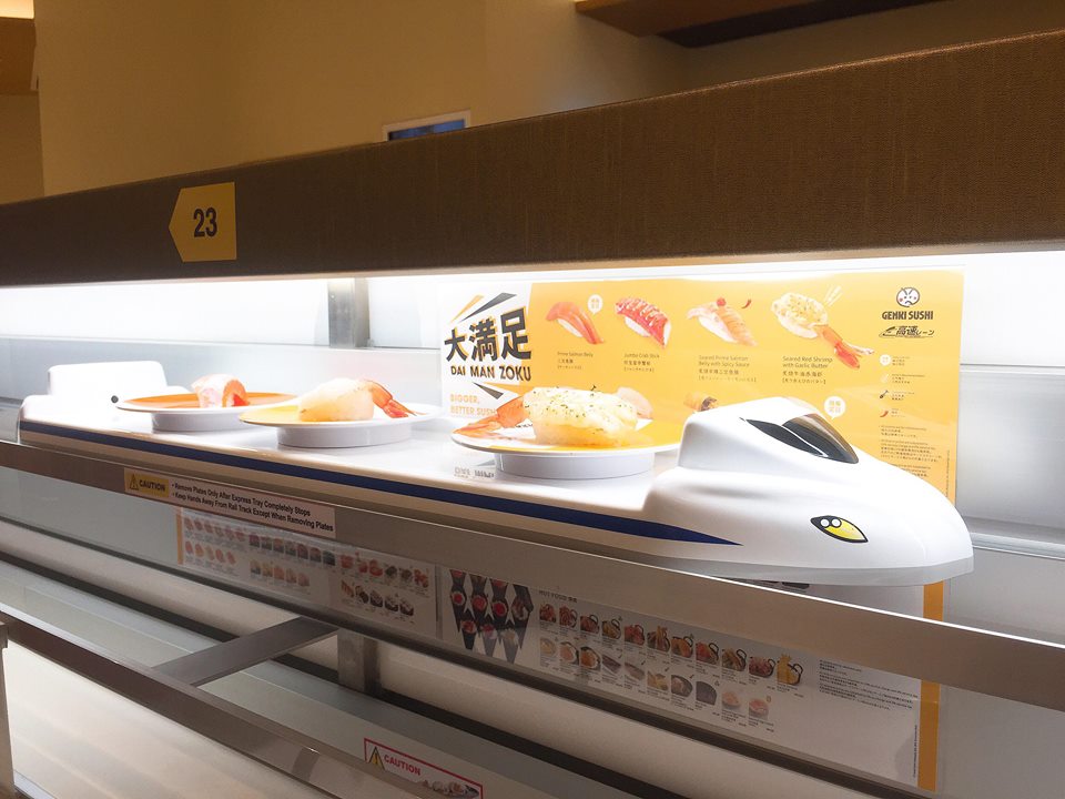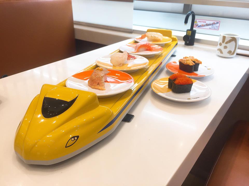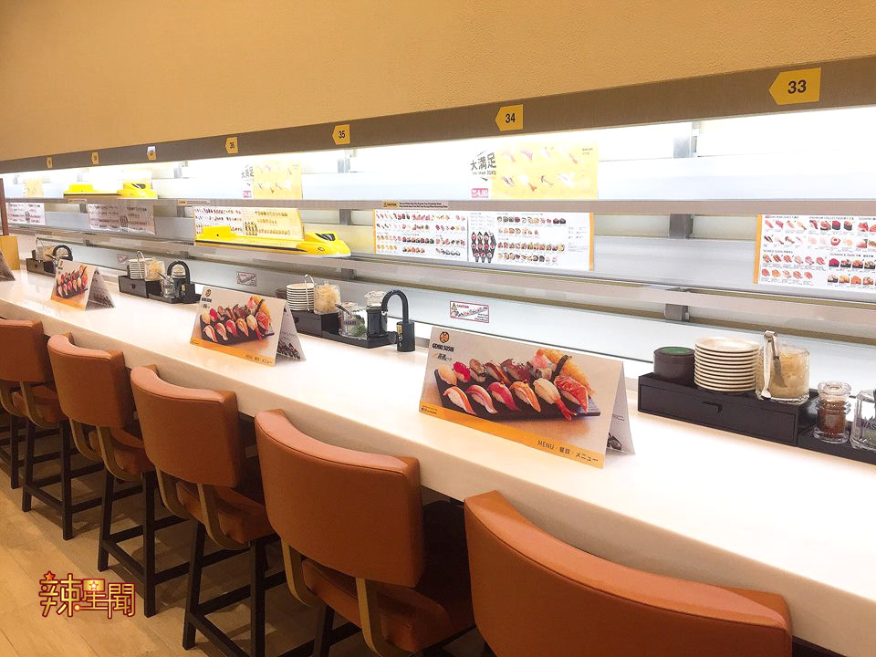 店内有12条高速线列车轨道,每个位子都会对着3层路轨,所以当你在吃寿司时,会有3架火车不间断的经过,非常好玩!小朋友看到也一定会很开心!可惜的是每架火车一次只可以放4碟寿司,每次下单最多也只能点8款!