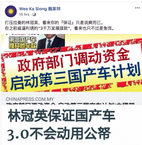 (吉隆坡30日讯)马华总会长魏家祥抨击,财政部长林冠英早前说第三国产车计划不会动用公帑的保证,只是讲爽的而已。