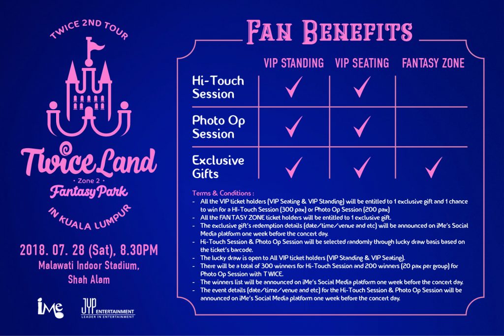 《TWICELAND ZONE 2: FANTASY PARK》首卖会将会在 4 月 21 日(星期六)早上 11 点至下午 3 点,在八打灵再也 Atria Shopping Gallery, Ground Floor, Centre Court 举行。一人能购买最多六张。现场购票者将会当场获赠一张限量海报(先到先得)。除此之外,