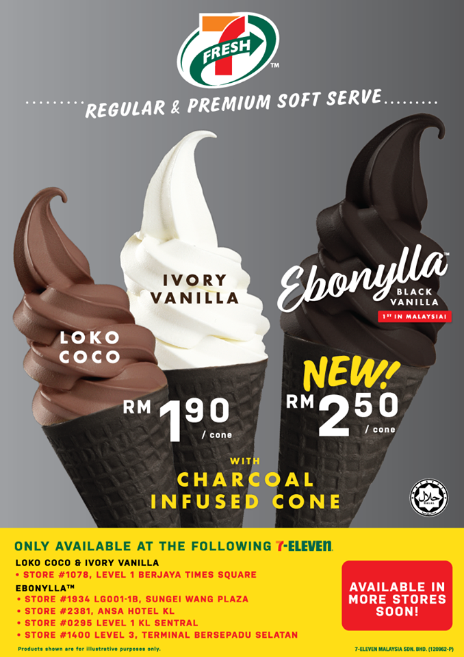 Eleven新推出的3种口味,包括Liko Coco、Ivory Vanilla及Ebonylla Black Vanilla 雪糕。前两个的价格分别是RM1.90,而Ebonylla Black Vanilla雪糕是Premium Soft Serve,所以价格是RM2.50!