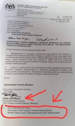该支持信是协助食肆业者拿到沙巴一所学校食堂竞标,虽然信中提到不愿插手教育部事务,但信件以副首相政治秘书的署名等于间接给予了教育部压力。
