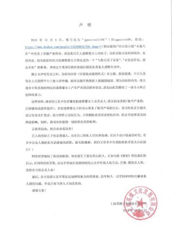 7日,naomi经纪公司在微博正式发表声明否认一系列网络传闻,并称网友发出的爆料贴是采取了打乱时间线路、东拼西凑、捕风捉影的形式,将康雅馨(naomi)女士塑造成了一个“与数名男子有染”、“对恋爱伴侣朋友不忠”的形象。而相关诽谤、侮辱言论已经涉嫌侵犯康雅馨(naomi)女士及其家人、朋友的名誉权,经纪公司正告相关谣言发布者立即删除恶意侵权内容,并保留一切法律追究的权利。