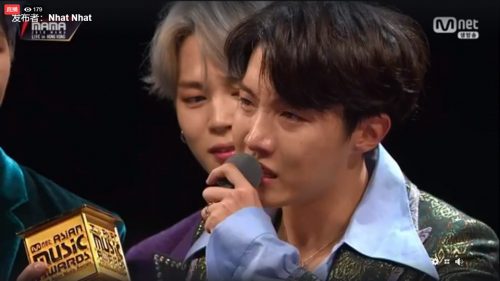 J-Hope在拿最佳年度歌手时在台上大喊粉丝昵称,接着就忍不住哽咽爆出,看着让粉丝开心又感动,身旁的成员见他哭得无法说话也立马上前给与安慰抱抱,他除了感谢粉丝一路的支持以外,还有感谢成员们的互相扶持才能一起走花路至今,场面非常温馨。