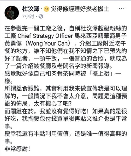 【特别报道】香港艺人杜汶泽与香港健美先生沈浩峰来马拍摄《走佬去马来》,他今日却在面子书大吐苦水,他声称被一名自称是“杜汶泽超级粉丝的工厂”的男子带到一家巴生肉骨茶店用餐,对方竟在他不知情下预约好记者来拍照,他在面子书写:“一顿午饭,一张普通的合照,就成为了一篇介绍该餐厅及老板名字的新闻报导”,让他不爽直指“被摆上台”!