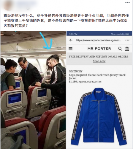一名网友今早在面子书上传林冠英一家在飞机上被拍的照片及林冠英儿子身穿的外套价格抨击:“穿千多镑的外套乘经济舱更不是什么问题,问题是你的孩子能穿得上千多镑的外套。”