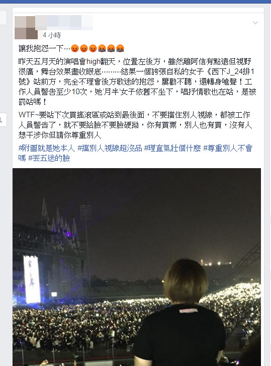 不仅如此,网友透露,现场工作人员已经警告该位站着的歌迷至少10次,但她屡劝不听,就连五月天唱抒情歌时也站,网友气愤地表示:“要站下次买摇滚区或站到最后面,不要挡住别人视线,都被工作人员警告了,就不要给脸不要脸硬拗,你有买票别人也有,没有人想干涉你,但请你也尊重别人。”