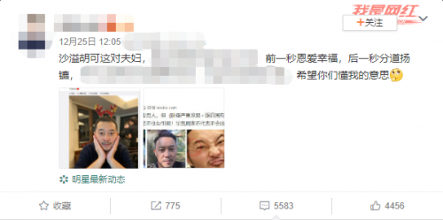沙溢回应被预测会离婚:会在监督下做好该做的 28 Dec , 2018 | 娱乐前线 某账号在微博发文,预测沙溢将会和胡可离婚:“前一秒恩爱幸福,后一秒分道扬镳”。该博主还暗指沙溢将出轨,随后,沙溢在该微博下方留言:“看得出来你是我的好朋友,我一定在你的监督下努力做好自己该做的。谢谢。” 博主预测沙溢胡可将离婚 沙溢亲自留言回复 胡可晒出一张儿子的照片,并配文称:“真逗”,疑回应被预测离婚一事。网友纷纷表示:“不用理这种人。”“无凭无据,净瞎说!”“沙溢真的是个好丈夫!” 胡可晒出一张儿子的照片,并配文称:“真逗” 分享