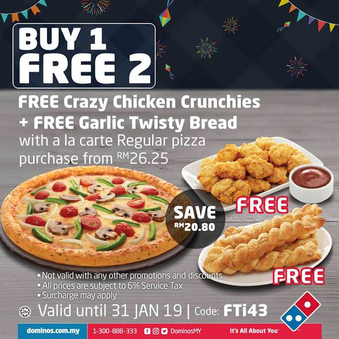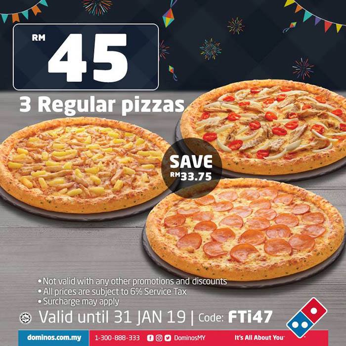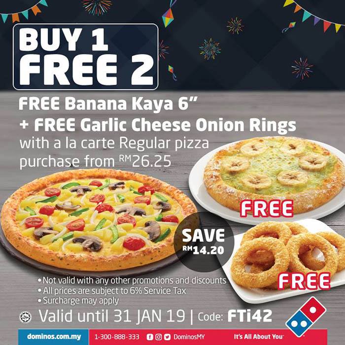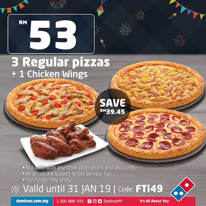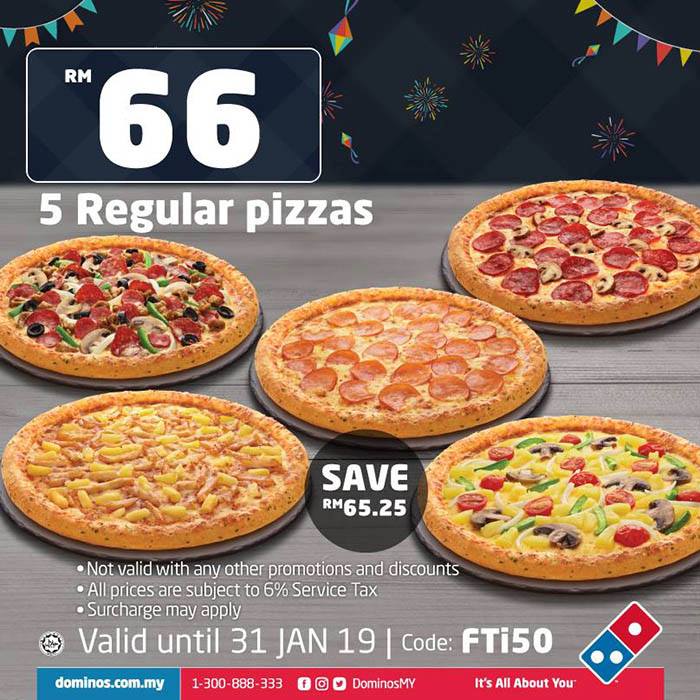 Domino优惠大放送 RM66购得5个披萨 1 Jan , 2019 | 吃喝玩乐 RM66即可购得5个披萨!?朋友是时候开派对了! Domino’s Pizza推出最新优惠劵,现只需RM66即可购得5个披萨,可节省高达RM65!其他优惠包括买一送一、买一送二及特价折扣等,非常划算! 这项优惠,从即日起至1月31日,喜欢吃披萨或近期打算开派对的朋友,可以考虑喔! 分享